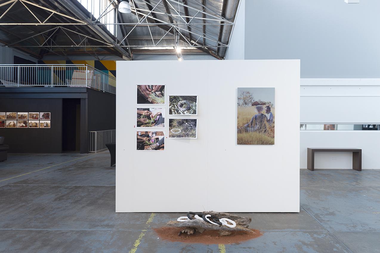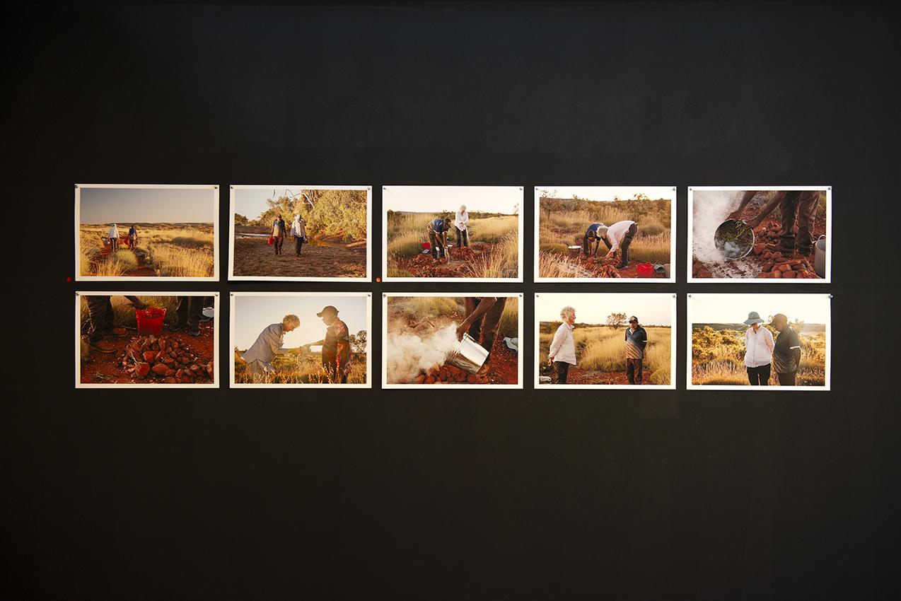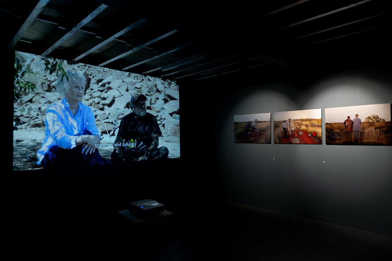 Photo showing the documentary playing at the gallery and alongside three large photographic prints on aluminium of Desmond Taylor and Helen Seiver 'making sacred' on site at Nullagine, photographed by Samuel Tetlaw.