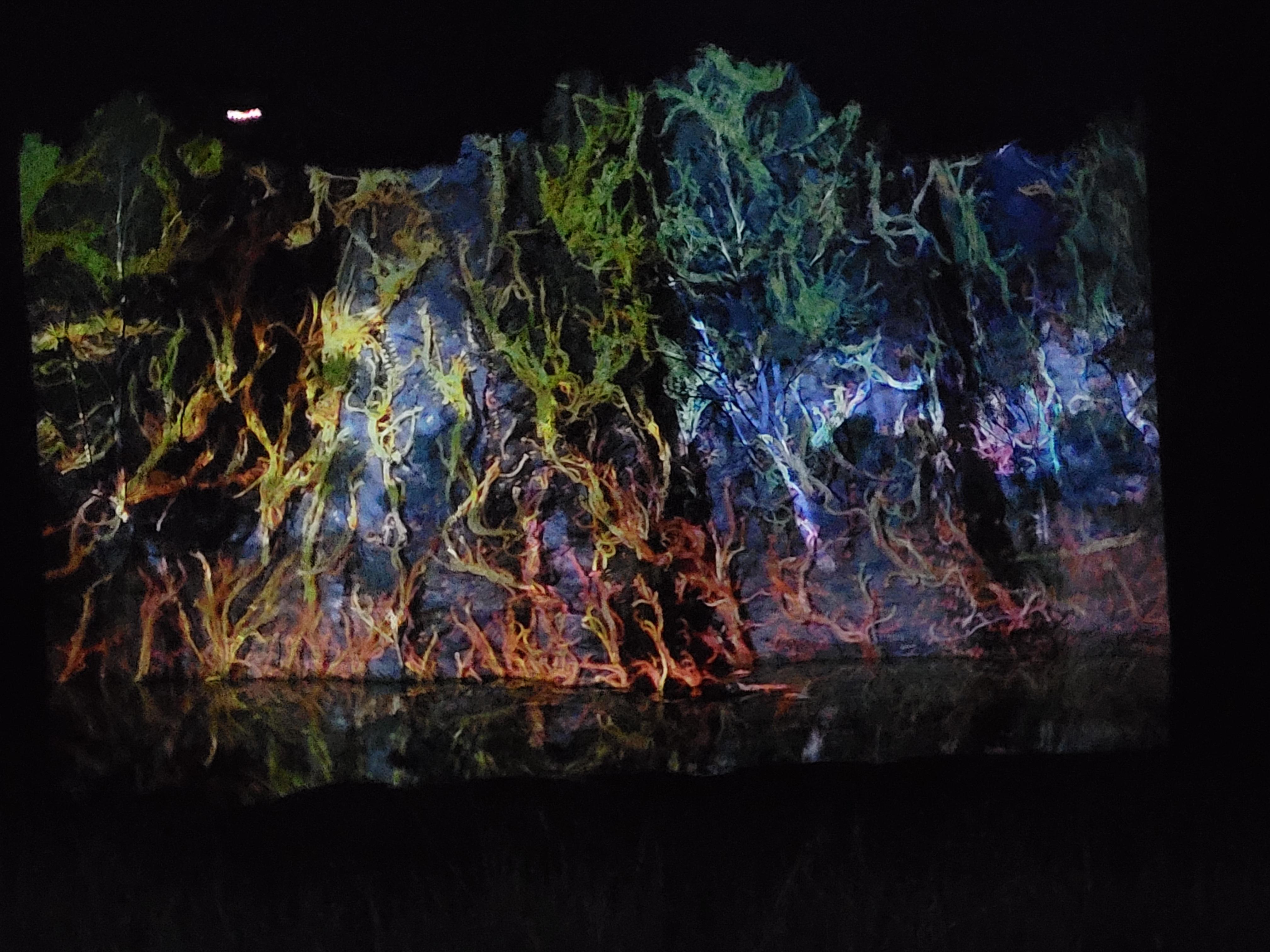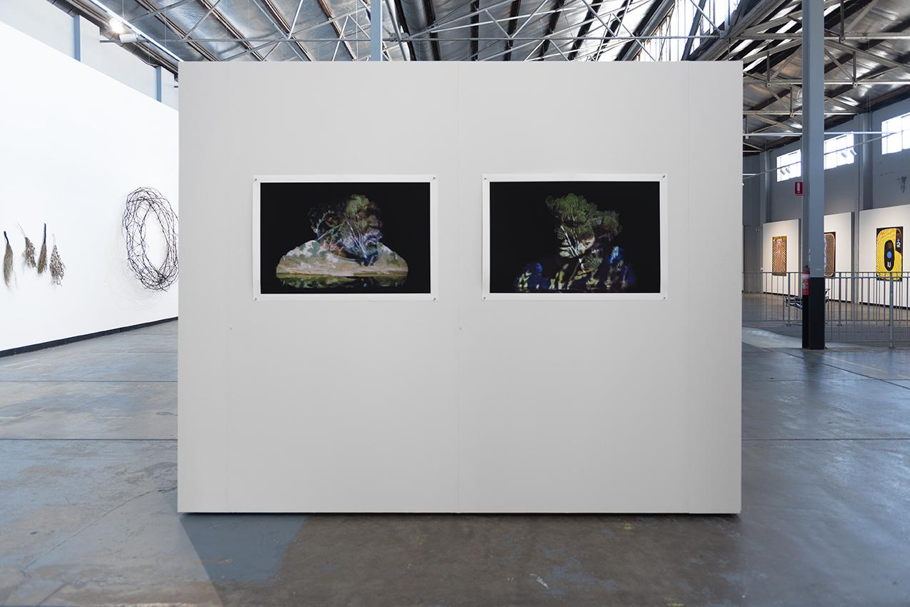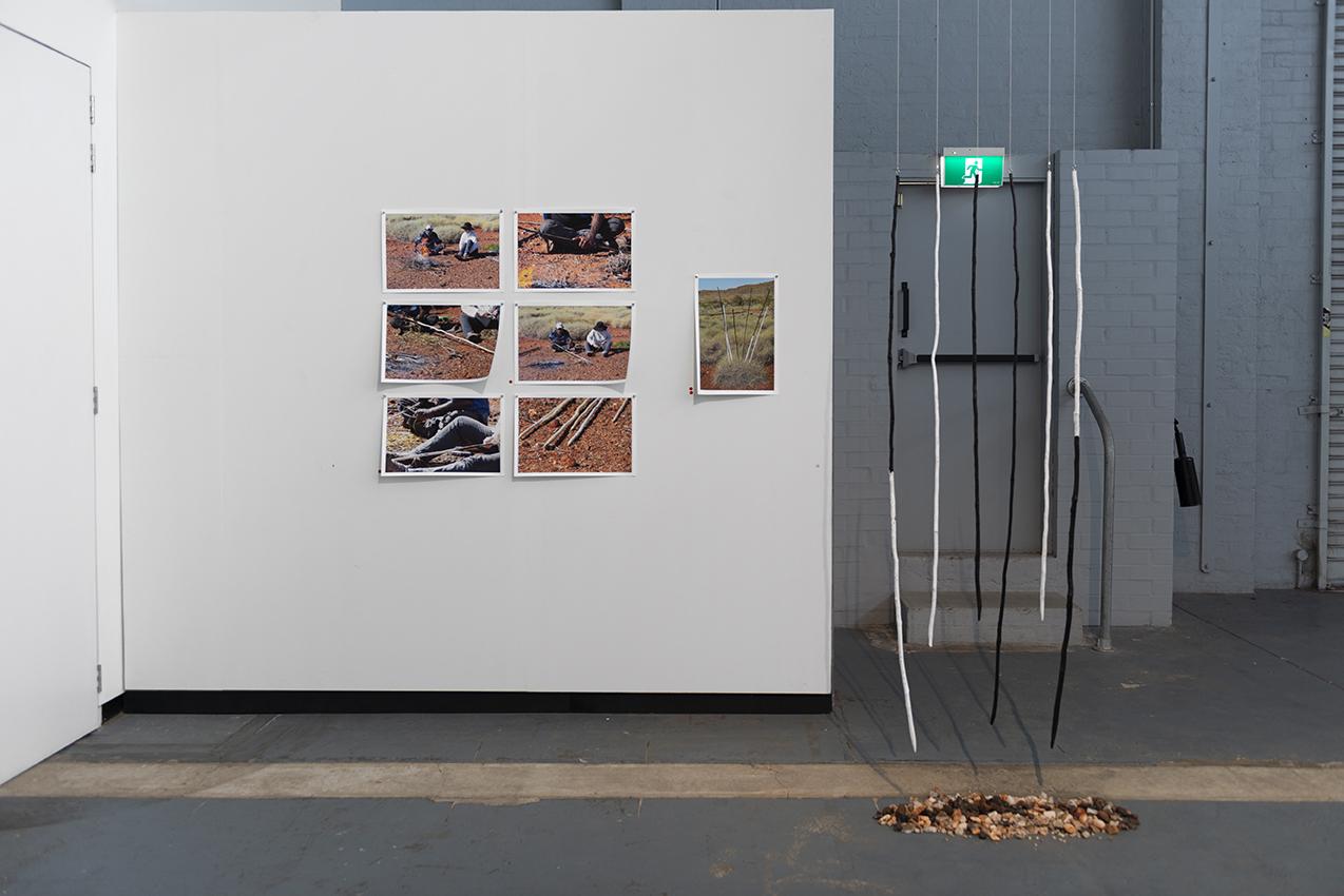 Photo showing the documentary playing at the gallery and alongside three large photographic prints on aluminium of Desmond Taylor and Helen Seiver 'making sacred' on site at Nullagine, photographed by Samuel Tetlaw.