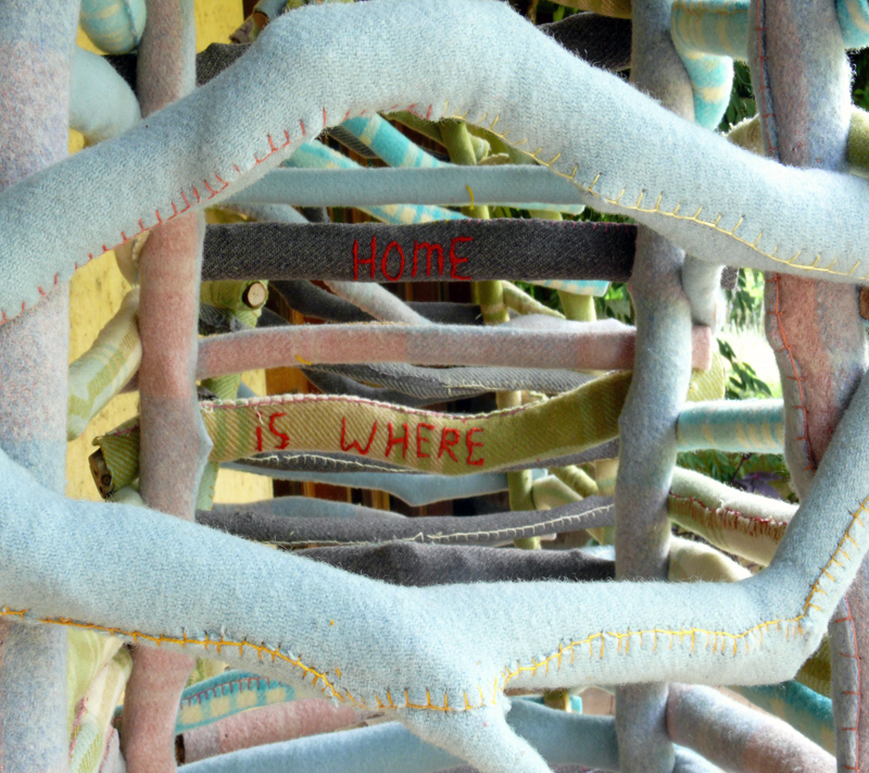 The work utilizes text, found objects and textiles to make sense of and broaden the understanding of this topic.