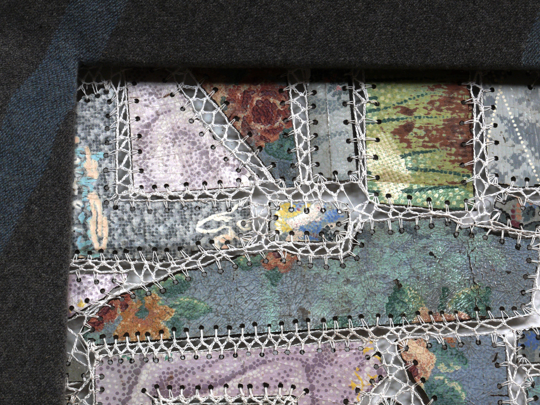 Reflecting the essential part women have played in determining the nature, shape and structure of contemporary female role and identity, this work functions as a review of cultural values: What is the real value of Gross Domestic Product? When you tease apart the words, domestic chores, silent endeavors? By using reclaimed household floor covering, held together with a painstaking stitch, I am seeking to look closely at things we take for granted and have forgotten to see, of daily ongoing rituals that give meaning but in themselves become meaningless.