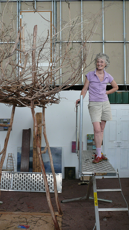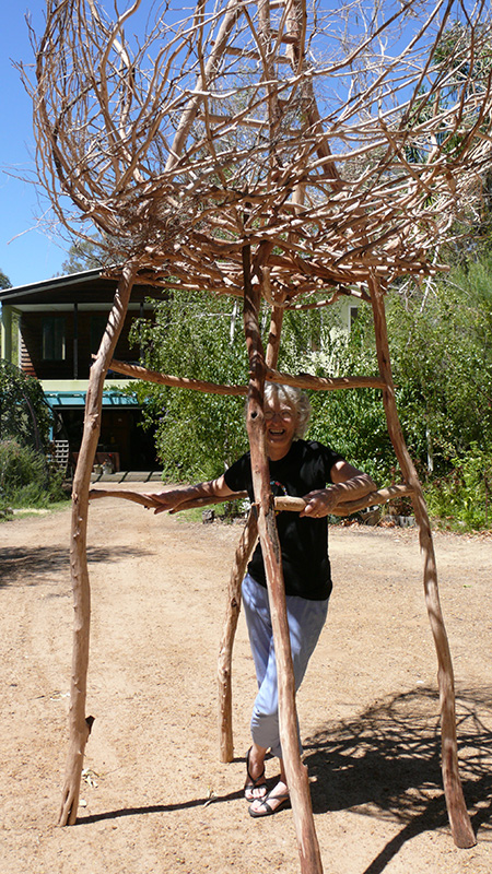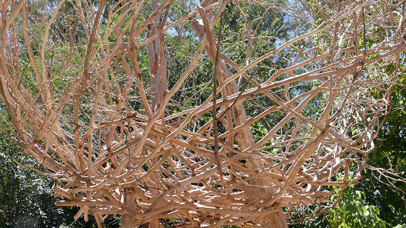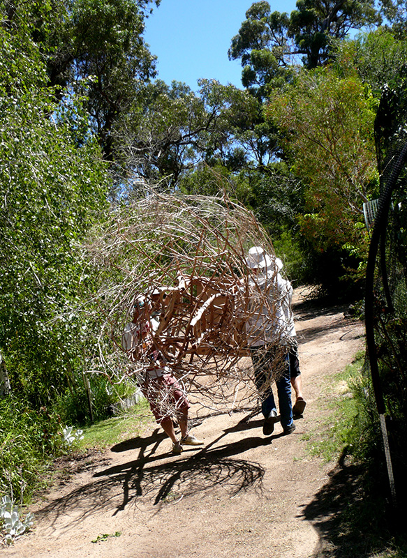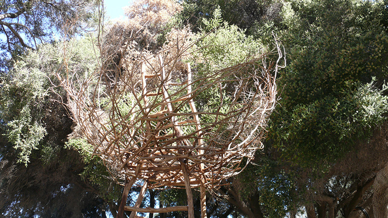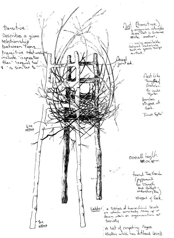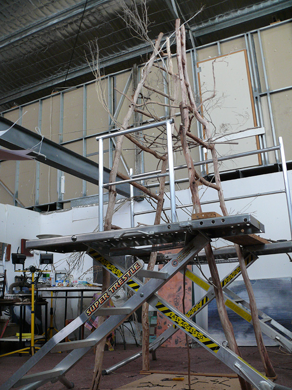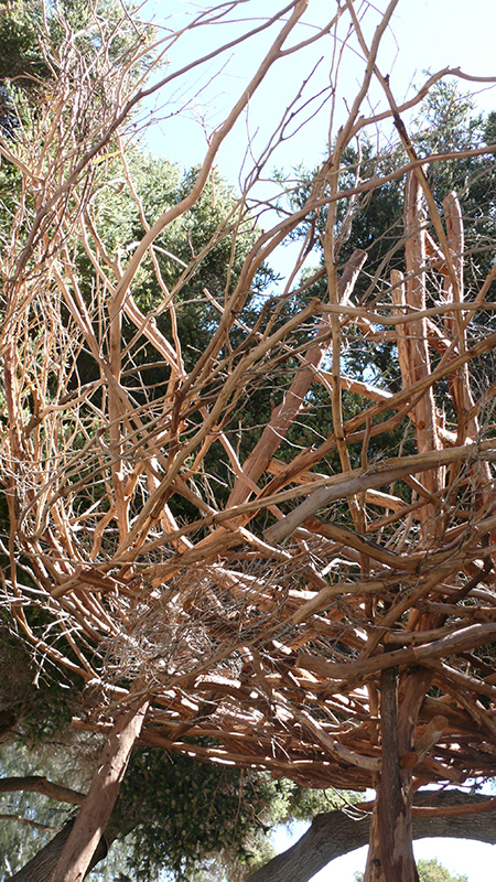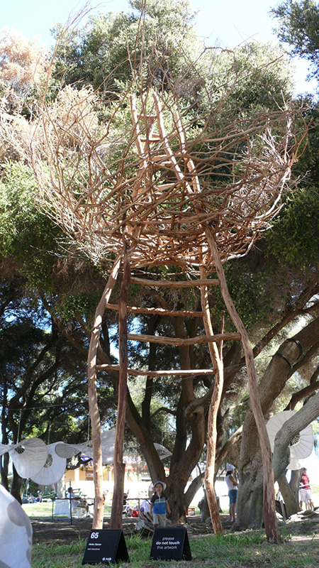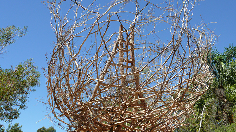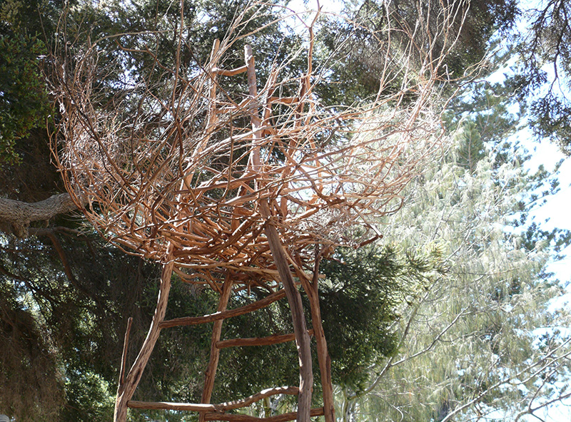 This site specific work uses symbols of Ladder 1 and Nest 2 to discuss the Cottesloe invasion of Rainbow Lorikeets and the displacement of local bird species, in particular the Purple Crowned Lorikeet. The Rainbow Lorikeet has through its superiority risen through the hierarchy of bird species to sit on top of the ladder. It has a very large flight area, 50 square kms daily, a voracious feeder and occupies tree/nest hollows displacing many other species.