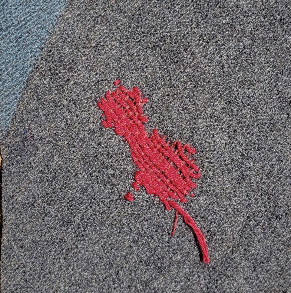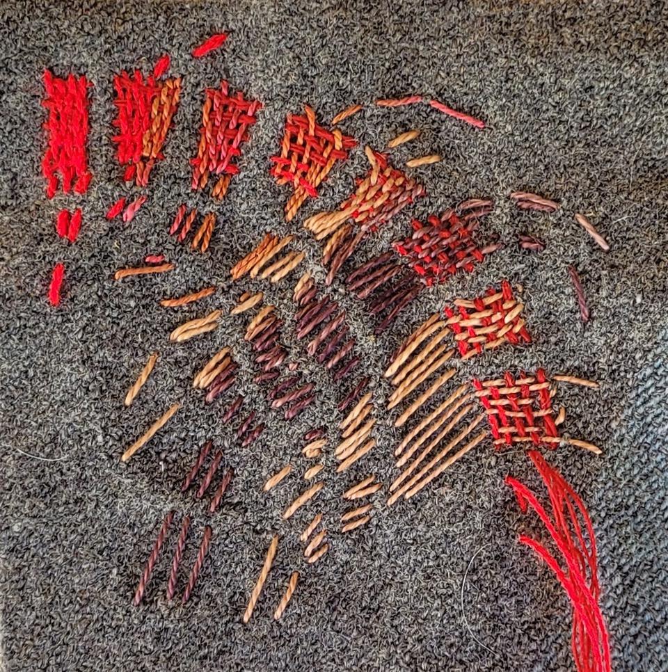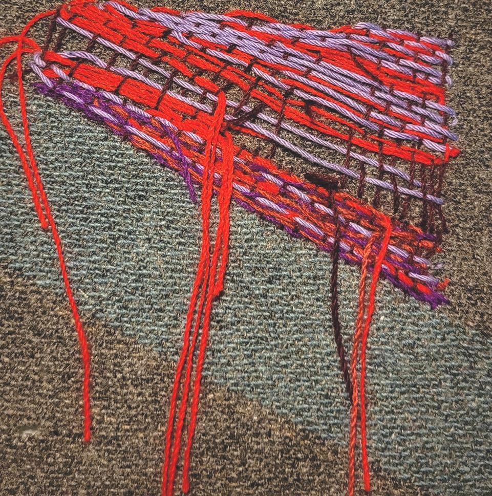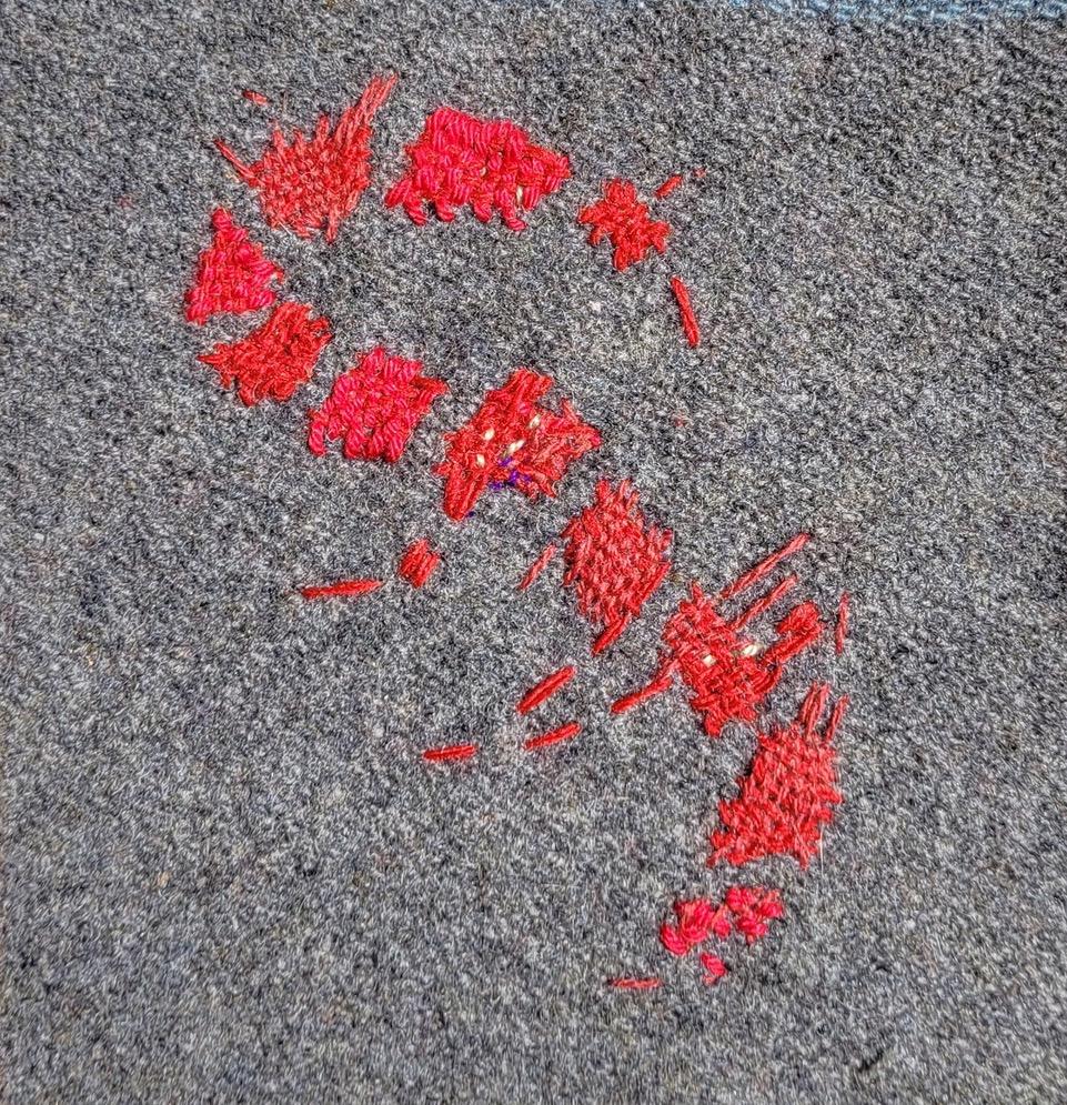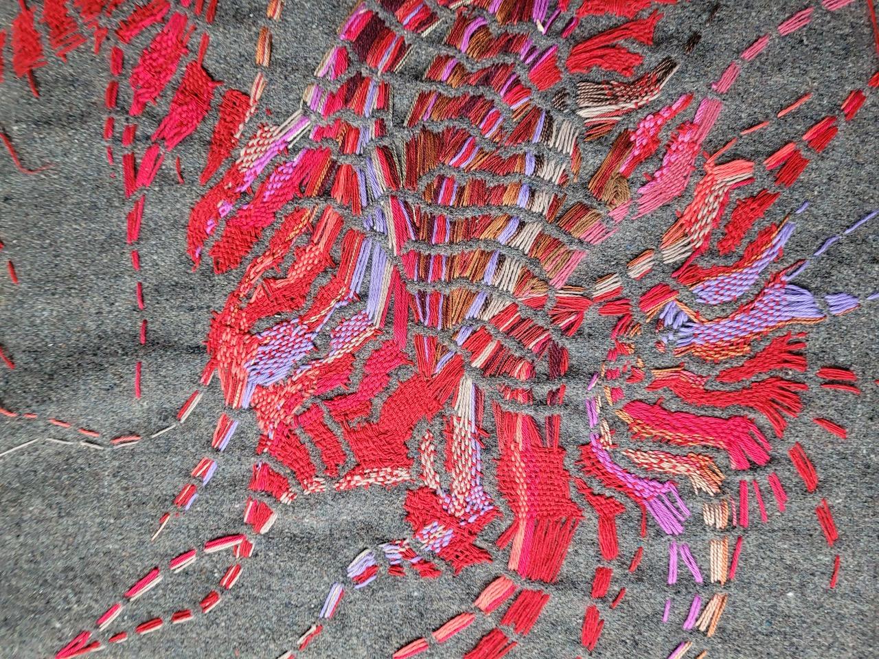 This work uses the shape and the imagined geographical boundary of the Nullagine River to speak about the framing and creation of psychological boundaries of making art within personal context. Through intentional processes this work attempts to untangle the threads, then re-weave the story by darning and repairing, making whole, healing and cleansing.