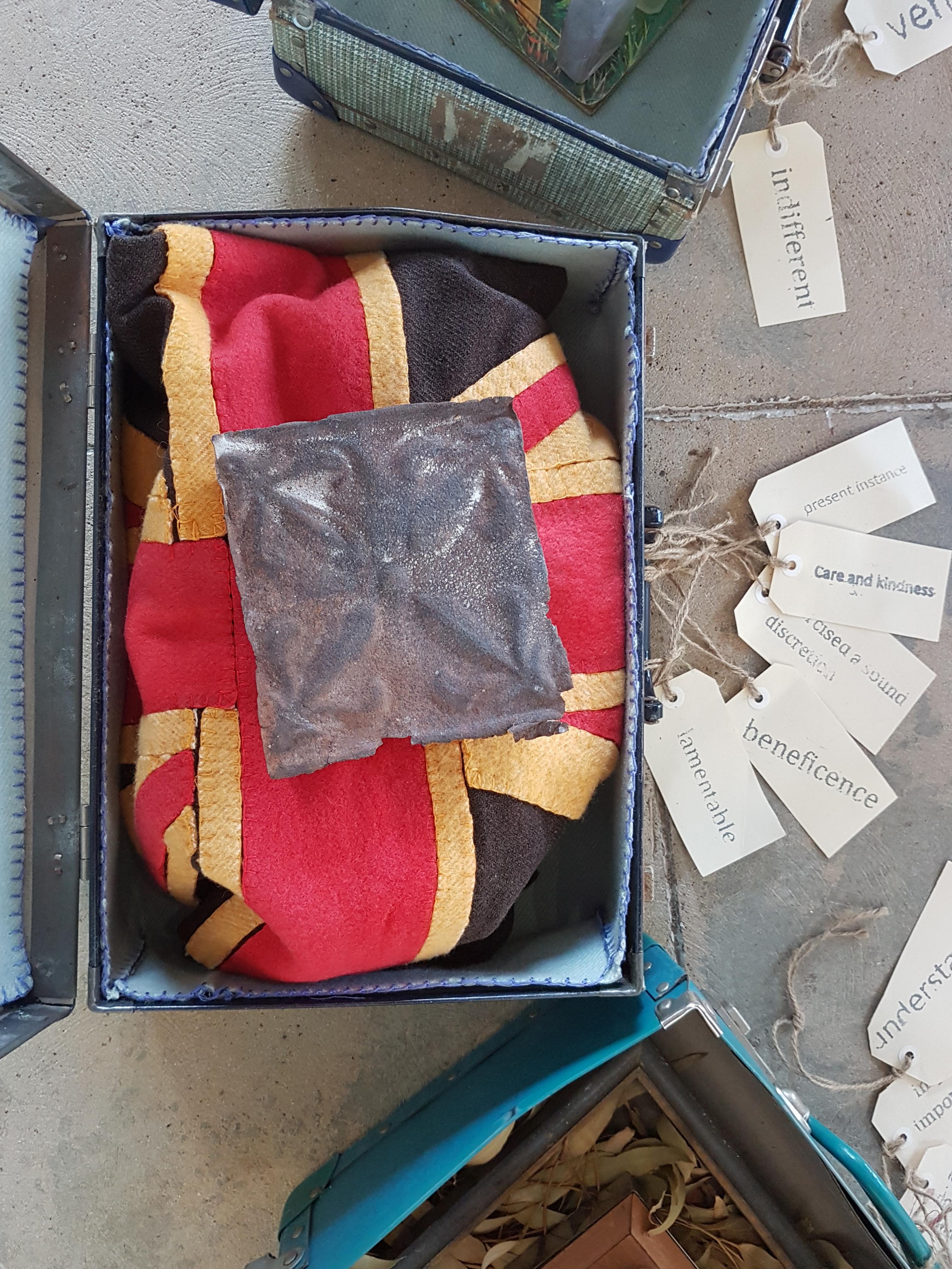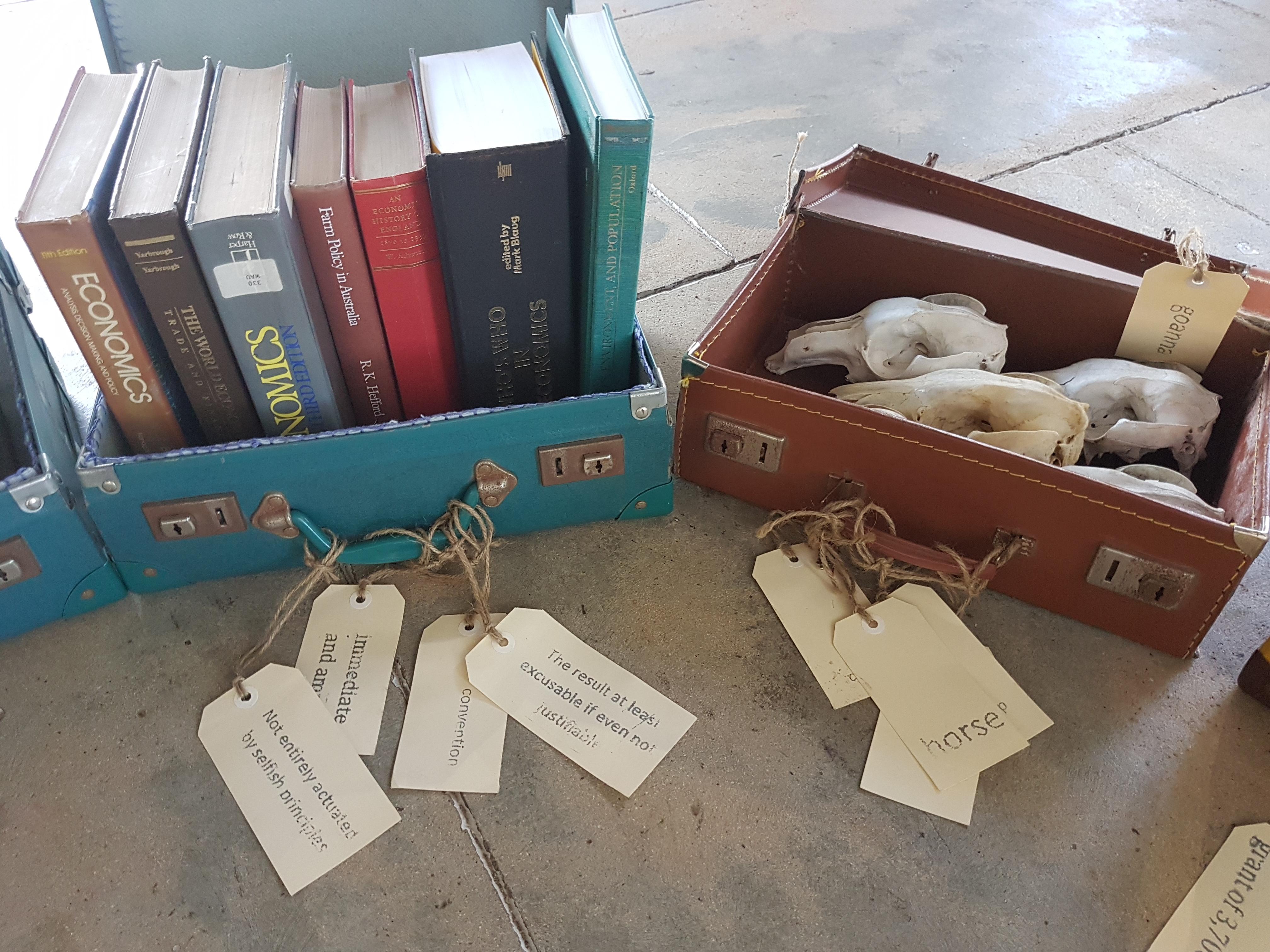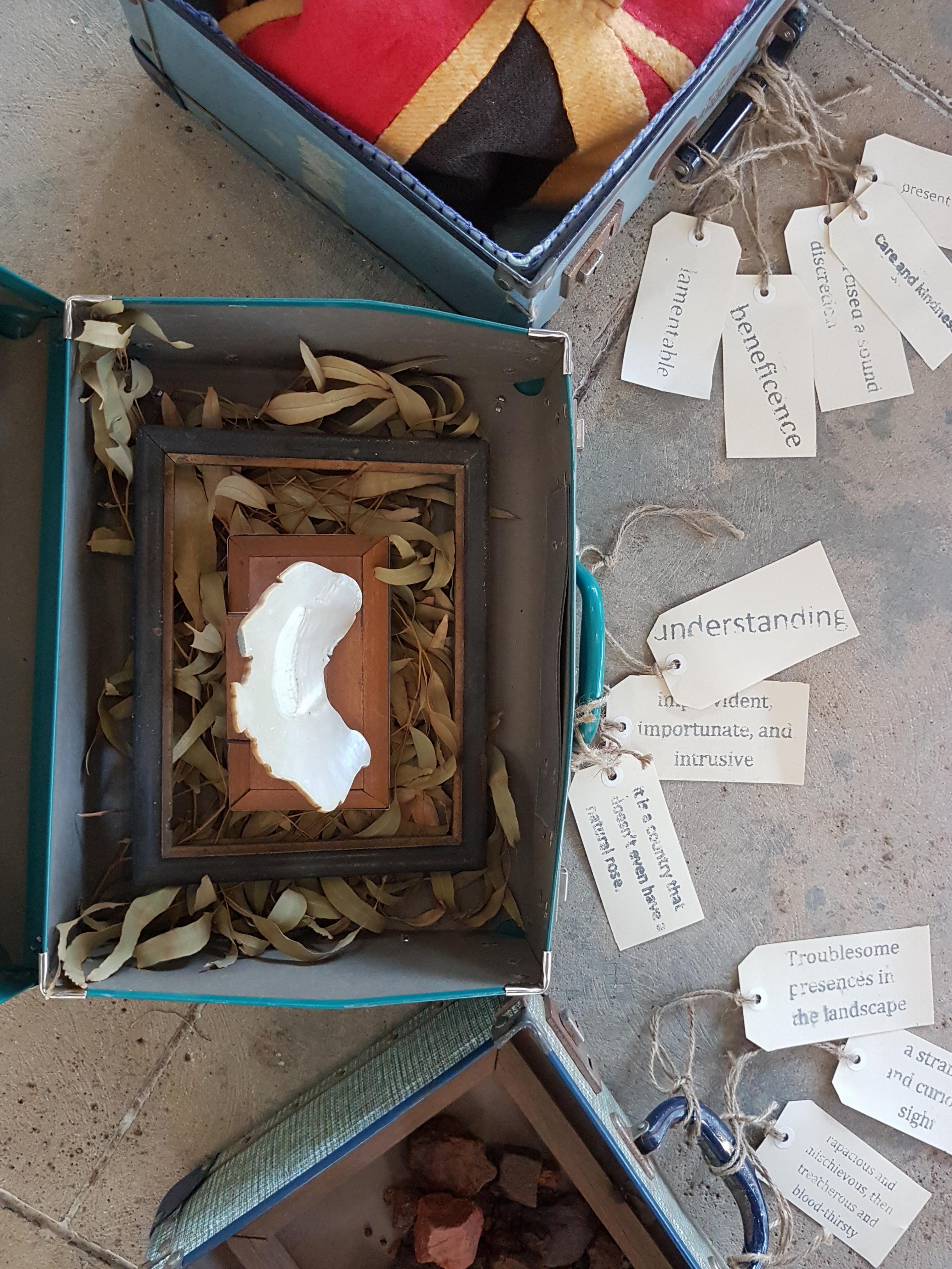 Words create impressions, uphold expectations and have the ability to influence how we think and live. This installation explores the power of words and their juxtaposition with certain objects to give context and uphold a particular perspective. The individual words have been taken from West Australian Archives of early colonial documents and the Bussell family diaries affirming a particular (paternalistic/colonial) attitude. In terms of contemporary use, some are still used to sustain a similar privileged viewpoint in spite of the passage of time since colonisation.